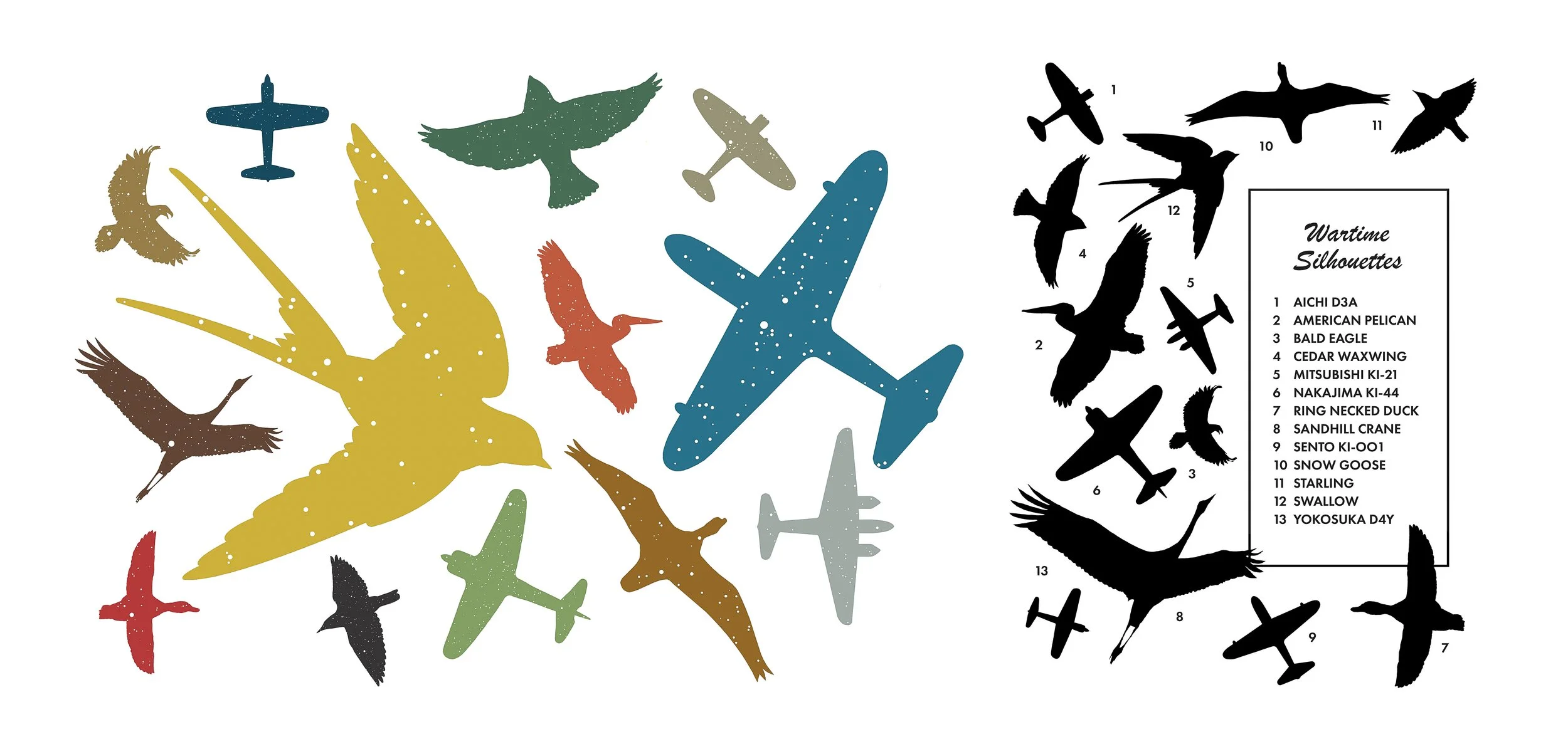 The identification chart references A Field Guide to Western Birds (1941) by Roger Tory Peterson. The pattern on the plane silhouettes is the night sky over Tacoma, Washington on December 7, 1941. The pattern on the bird silhouettes is the night sky over Newell, California on July 20, 1942, the first night of incarceration for my father at Tule Lake.