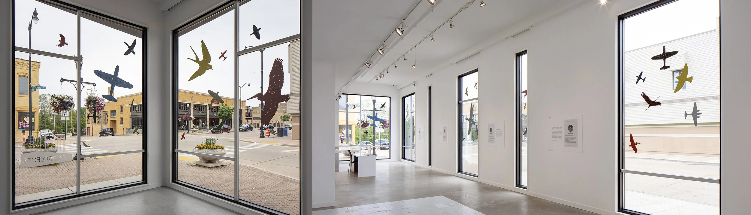 The installation of the work can take many forms. For a current exhibition at OS Projects, I’ve installed vinyl birds and planes, varying in size from 8 to 36” in diameter, to the large gallery windows.