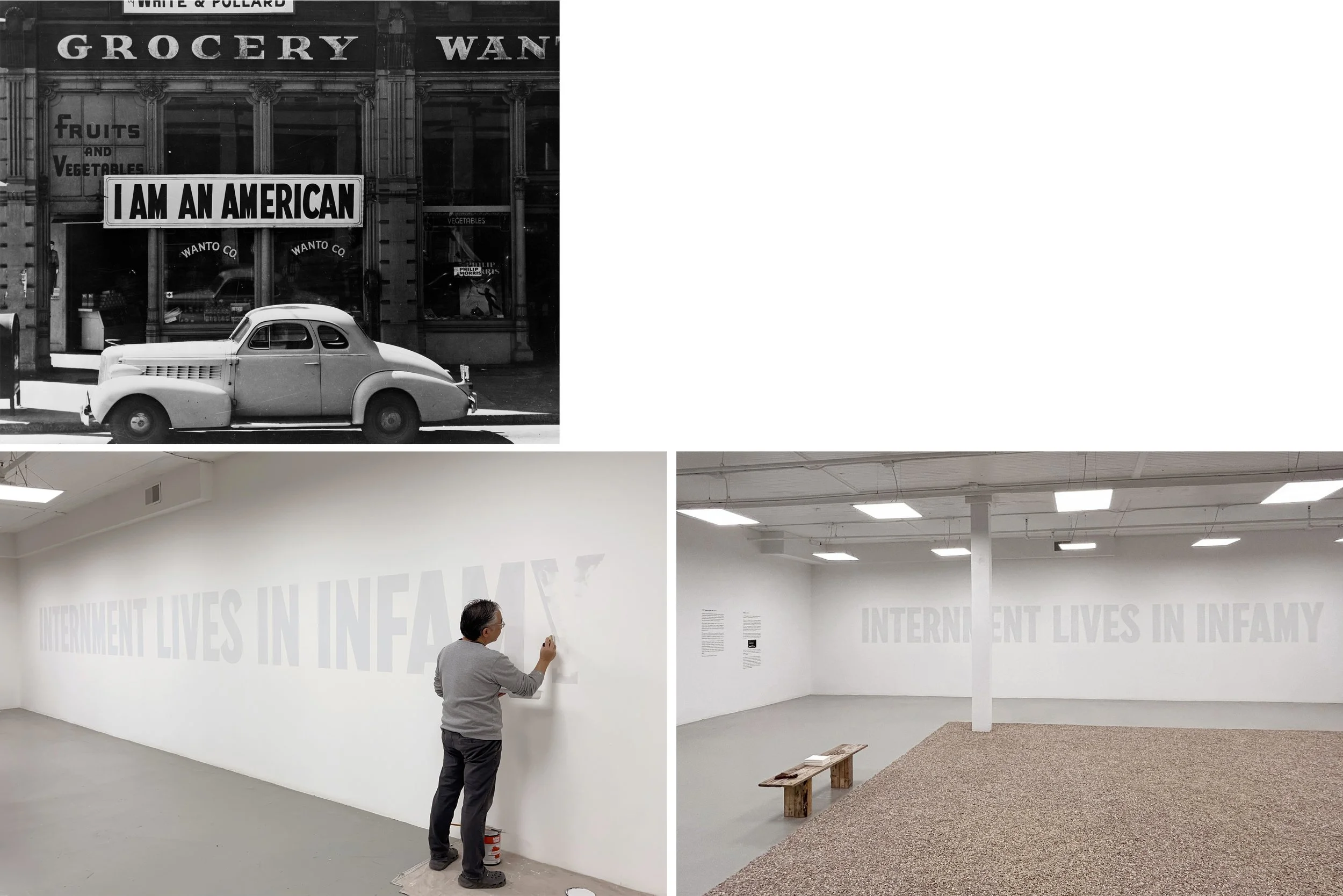 This work is inspired, in part by a sign posted on a Japanese American business in Oakland the day after Pearl Harbor was bombed. This photograph was made by Dorothea Lange.